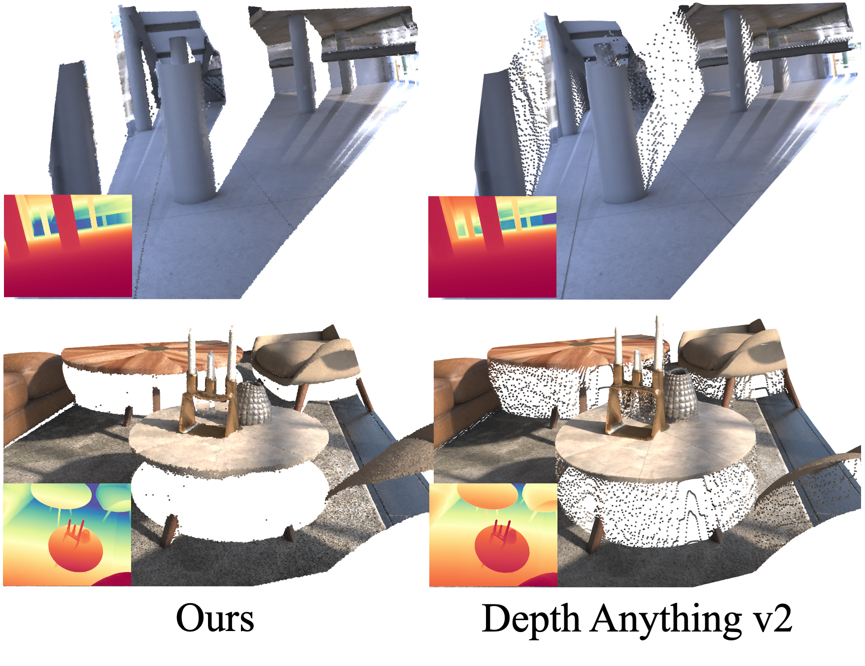 Gangwei Xu, Haotong Lin, Hongcheng Luo, Xianqi Wang, Jingfeng Yao, Lianghui Zhu, Yuechuan Pu, Cheng Chi, Haiyang Sun, Bing Wang, Guang Chen, Hangjun Ye, Sida Peng, Xin Yang NeurIPS 2025 (ratings:5,5,5,5) paper / code A monocular depth foundation model with pixel-space diffusion transformers, its estimated depth maps can recover high-quality, flying-pixel-free point clouds. |